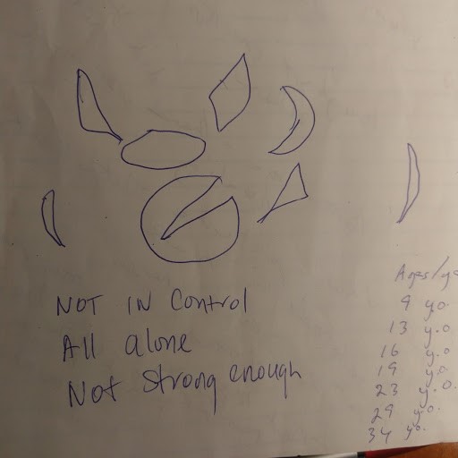 Therapy Interventions: Following are client depictions of worrying (directly below), therapist-client relationship (right), trauma (bottom left), and perpetrator (bottom right).
